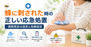 刺された後に全身のじんましん・息苦しさ・めまい・意識がもうろうとするなどの症状が出た場合は、アナフィラキシーの可能性があります。ためらわず119番に通報してください。