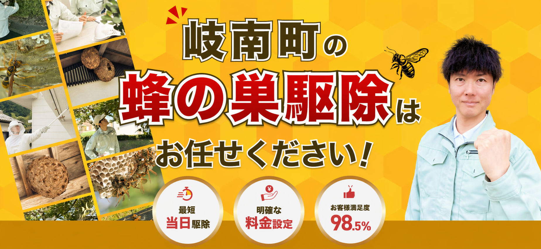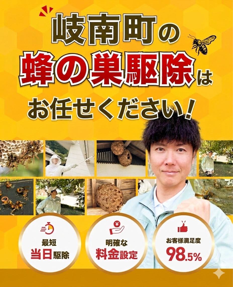 岐南町は人口増加エリアで新築住宅や分譲地が多く、引っ越し直後に蜂の巣を発見されるご相談も増えています。新しい家でも軒下・ベランダ・室外機まわりに巣が作られるケースが多く、早期の駆除が効果的です。写真をLINEでお送りいただければ概算料金をすぐにお伝えします。