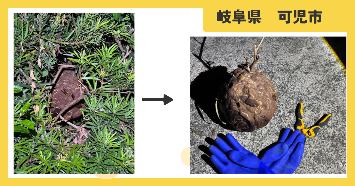 岐阜県可児市の庭の垣根で、直径30cm超のコガタスズメバチの巣を安全駆除。