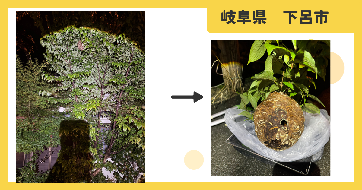 岐阜県下呂市にて、高さ5mの木の枝に作られたコガタスズメバチの巣を駆除しました。