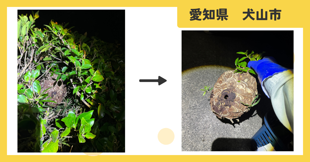 愛知県犬山市の垣根内に作られたコガタスズメバチの巣を駆除しました。