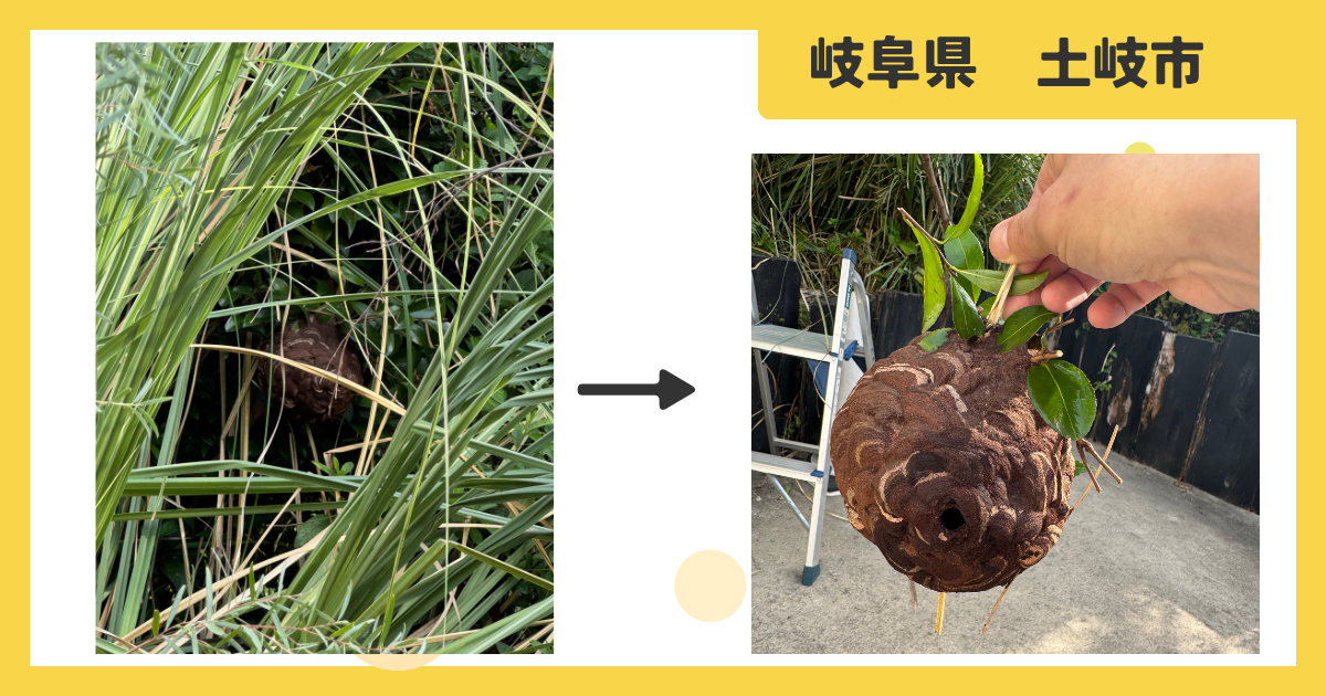 岐阜県土岐市のお宅より「庭の草むらに蜂が出入りしている」とのご相談をいただき、調査したところ直径15cmほどのコガタスズメバチの巣を確認しました。